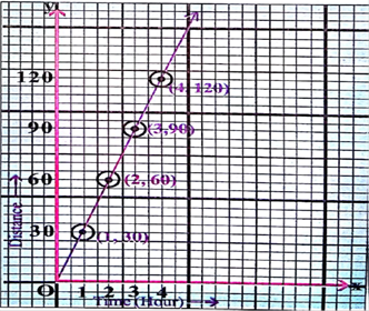 (ii) As in 1 hour, 30 km distance is covered hence 3 hours the distance covered is 3×30=90 km. And from the graph it can be seen that (3, 90) is one of the point on the line, so the x coordinate represents the time in hours and y coordinates represents the distance in km.