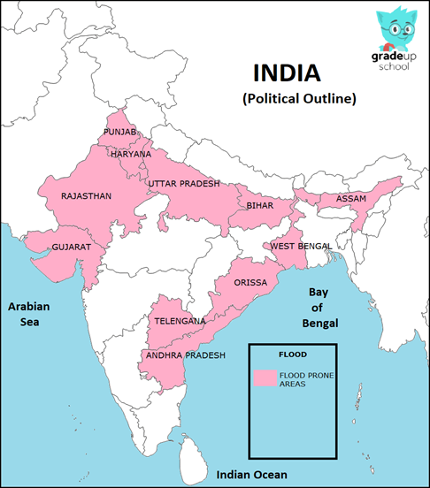 Show flood affected areas on the map of India.