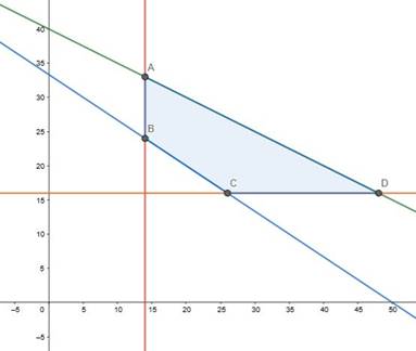 The corner points of feasible region are A(14,33) , B(14,24) , C(26,16), D(48,16).The value of Z at corner points are
