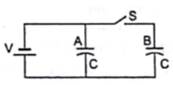 Shows two identical parallel plate capacitors connected to a battery through a switch S. Initially, the switch is closed so that the capacitors are completely charged. The switch is now opened and the free space between the plates of the capacitors is filled with a dielectric of dielectric constant 3. Find the ratio of the initial total energy stored in the capacitors to the final total energy stored.