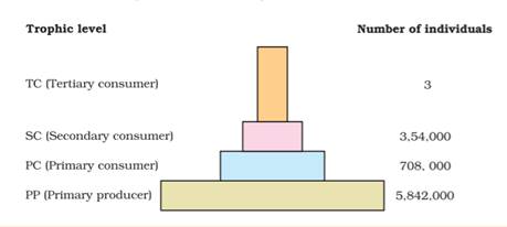 In grassland, there is a pyramid of number that is followed where the producers (grasses) are always maximum in number. Then there is a decrease towards apex, as the primary consumers (herbivores) are lesser in number than the grasses; the secondary consumers like snakes, are lesser in number than the primary consumers and the tertiary consumer’s like hawks are least in number. Thus, the pyramid becomes upright.