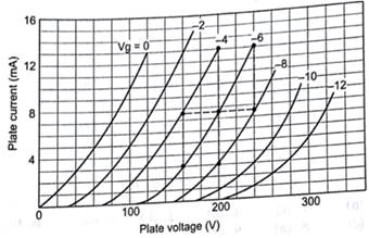 Considering two points in the graph where Vp=200 V we get ip1=13 mA ip2=3mA Vg1=-4 V, Vg2=-8 V