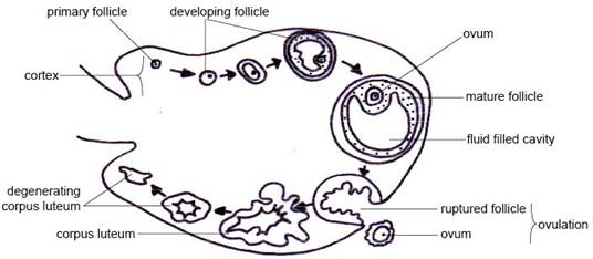 (a) Draw a labelled diagram of sectional view of human ovary showing different stages of oogenesis.