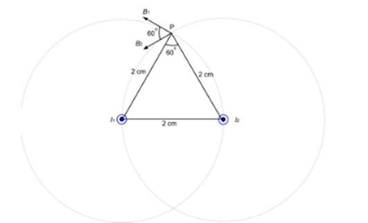 These two wires and point P form an equilateral triangle of side 0.02 m.