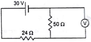 The voltmeter shown in figure reads 18 V across the 50 Ω resistor. Find the resistance of the voltmeter.