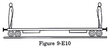 Two persons each of mass m are standing at the two extremes of a railroad car of mass M resting on a smooth track (figure 9-E10). The person on left jumps to the left with a horizontal speed u with respect to the state of the car before the jump. Thereafter, the other person jumps to the right, again with the same horizontal speed u with respect to the state of the car before his jump. Find the velocity of the car after both the persons have jumped off.