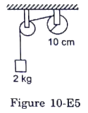 A string is wrapped on a wheel of moment of inertia 0.20 kg-m2 and radius 10 cm and goes through a light pulley to support a block of mass 2.0 kg as shown in figure (10-E5). Find the acceleration of the block.