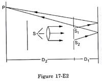 A double slit S1 - S2 is illuminated by a coherent light of wavelength λ. The slits are separated by a distance d. A plane mirror is placed in front of the double slit, at a distance D1 from it and a screen ∑ is placed behind the double slit at a distance D2 from it (figure 17-E2). The screen ∑ receives only the light reflected by the mirror. Find the fringe-width of the interference pattern on the screen.