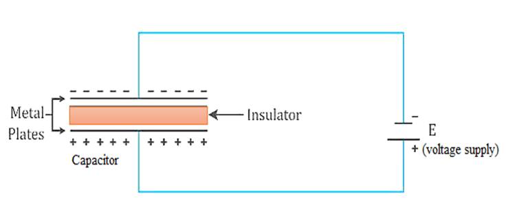 Consider a parallel plate capacitor connected across a d.c. voltage supply as shown in the figure. When the circuit is closed, the electric current will flow through it. As the charges reaches to the plate, the insulating gap does not allow the charges to move further; hence, positive charges get deposited on one side of the plate and negative charges get deposited on the other side of the plate. When the voltage starts to develop, the electric charge begins to resist the deposition of further charge. Thus, the current flowing through the circuit gradually becomes less and then zero till the voltage of the capacitor is exactly equal but opposite to the voltage of the battery. This is how the capacitor gets charged when it is connected across a d.c. battery.