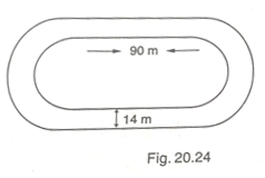 The inside perimeter of a running track (shown in Fig. 20.24) is 400 m. The length of each of the straight portion is 90 m and the ends are semi-circles. If track is everywhere 14 m wide, find the area of the track. Also, find the length of the outer running track.