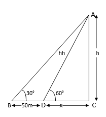 A person observed the angle of elevation of the top of a tower as 30°. He walked 50 m towards the foot of the tower along level ground and found the angle of elevation of the top of the tower as 60°. Find the height of the tower.