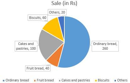 In one day the sales (in rupees) of different items of a baker’s shop are given below :