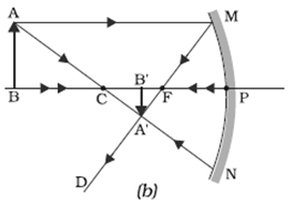 (b) Ray diagram when the object is placed between the focus and centre of curvature of concave mirror: