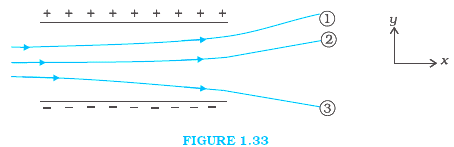 Figure 1.33 shows tracks of three charged particles in a uniform electrostatic field. Give the signs of the three charges. Which particle has the highest charge to mass ratio?