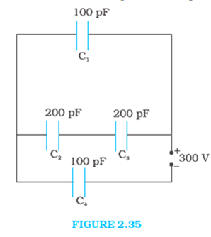 Potential difference across C1 is given by, V1 = V-V4 = 300-200 = 100V