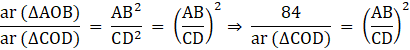 In a trapezium ABCD, it is given that AB || CD and AB = 2CD. Its diagonals AC and BD intersect at the point 0 such that ar (ΔAOB) = 84 cm2. Find ar (ΔCOD).