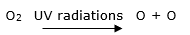 When higher energy ultraviolet radiations acts on the oxygen at the higher level of the atmosphere, the UV radiation is splits the oxygen gas into free oxygen atoms. The reaction is as follows: