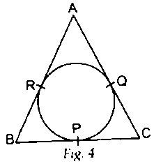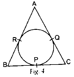 In Fig. 4, an isosceles triangle ABC, with AB = AC, circumscribes a circle. Prove that the point of contact P bisects the base BC.