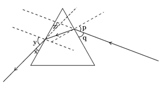 Angle of incidence is p as it is the angle between incident ray and normal. The angle of emergence is y between emergent ray and normal and angle of deviation is z angle between incident ray and emergent ray.
