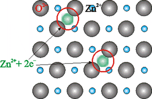 The excess of Zn2+ ions thus formed get trapped into the vacant interstitial sites and electrons in the neighboring interstitial sites.