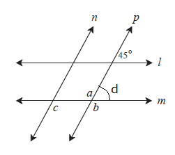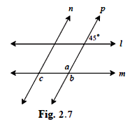 In figure 2.7 line /|| line m and line n|| line p. Find ∠ a, ∠ b, ∠ c from the given measure of an angle.