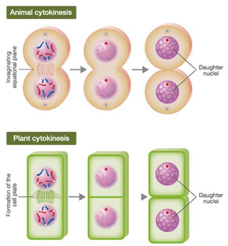 In animal cells, an invagination is formed at the equatorial plane of the cell which deepens gradually which results into two new cells are formed. However, in plant cells cytokinesis takes place by a cell plate is formation along midline of the cell resulting into two daughter cells.
