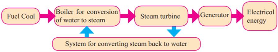 2. The thermal energy released due to burning of fuel produces steam at very high temperature and pressure. This energy in the steam drives the turbine.