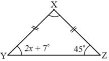 Given: In Δ XYZ, XY ≅ XZ, m∠ Y = (2x + 7)° and m∠ Z = 45°