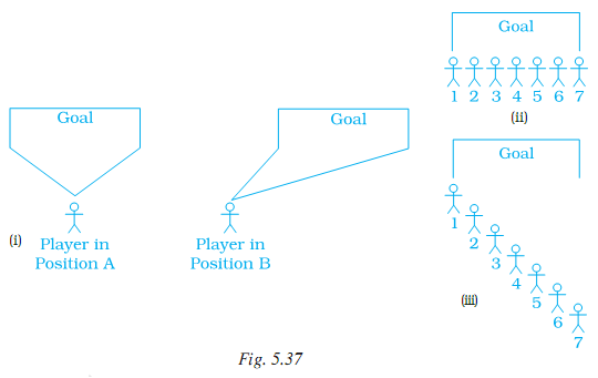 The drawings below (Fig. 5.37), show angles formed by the goalposts at different positions of a football player. The greater the angle, the better chance the player has of scoring a goal. For example, the player has a better chance of scoring a goal from Position A than from Position B.