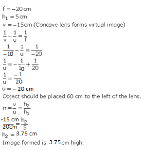 A concave lens has a focal length of 20 cm. At what distance from the lens a 5 cm tall object is placed so that it forms an image at 10 cm from the lens? Also calculate the size of the image formed.