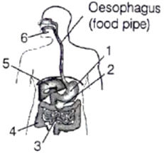 The diagram shows the human gut. Which numbered structures secrete digestive enzymes?
