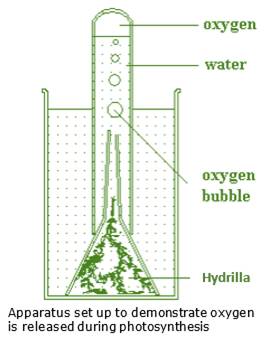 Take a beaker to fill it with water and put Hydrilla plant in the beaker. Cut the base of the plants, tie them with a thread and cover them with an inverted funnel in such a manner that the cut end of the plant is towards the neck of the funnel. Keep the whole apparatus in sunlight for some time and observe.