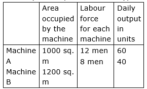 Since, each machine of type A and B requires 1000sq. m and 1200 s. m area so, x machine of type A and y machine of type B require 1000x and 1200y sq. m area but,