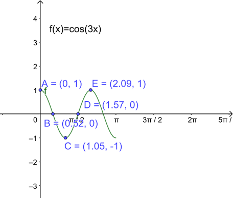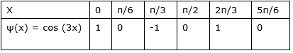 ∴ ψ (x) = cos (3x) is a periodic function with period 2π/3. So, we will draw the graph of ψ (x) = cos (3x) in the interval [0, 2π/3]. The values of ψ (x) = cos (3x) at various points in [0, 2π/3] are listed in the following table: