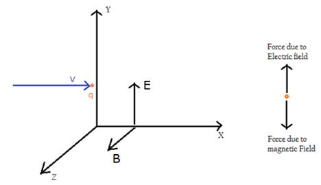 (a) A particle of charge q is moving with velocity v in the presence of crossed Electric field E and Magnetic field B as shown. Write the condition under which the particle will continue moving along x-axis. How would the trajectory of the particle be affected if the electric field is switched off?