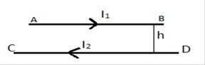 (b) A horizontal wire AB of length ‘l’ and mass ‘m’ carries a steady current I1, free to move in the vertical plane is in equilibrium at the height of ‘h’ over another parallel long wire CD carrying a steady current I2, which is fixed in a horizontal plane as shown. Derive the expression for the force acting per unit length on the wire AB and write the condition for which wire AB is in equilibrium.