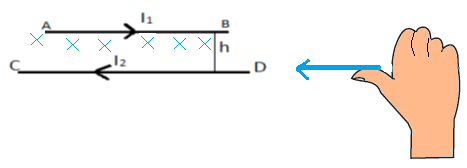 Now current in wire CD is towards left so curling our fingers with the thumb pointing to left we get that magnitude of the magnitude of magnetic field height h above wire CD where wire AB is placed is vertically inwards to the plane containing wire AB and CD