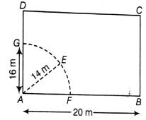 A cow is tied with a rope of length 14 m at the corner of a rectangular field of dimensions 20 m × 16 m. Find the area of the field in which the cow can graze.