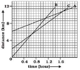 Fig 8.11 shows the distance-time graph of three objects A,B and C. Study the graph and answer the following questions: