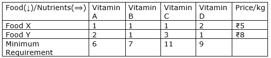 A dietician mixes together two kinds of food in such a way that the mixture contains at least 6 units of vitamin A, 7 units of vitamin B, 11 units of vitamin C and 9 units of vitamin D. The vitamin contents of 1 kg of food X and 1 kg of food Y are given below :
