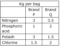 A fruit grower can use two types of fertilizer in his garden, brand P and Q. The amounts (in kg) of nitrogen, phosphoric acid, potash, and chlorine in a bag of each brand are given in the table. Tests indicate that the garden needs at least 240 kg of phosphoric acid, at least 270 kg of potash and at most 310 kg of chlorine.