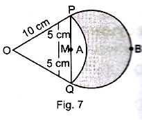 In fig. 7, are shown two arcs PAQ and PBQ. Arc PAQ is a part of circle with center O and radius OP while arc PBQ is a semi-circle drawn on PQ as diameter with center M. If OP = PQ = 10 cm, show that area of shaded region is.