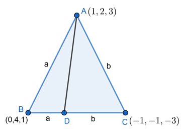 A(1, 2, 3), B(0, 4, 1), C(-1, -1, -3) are the vertices of a triangle ABC. Find the point in which the bisector of the angle ∠BAC meets BC.